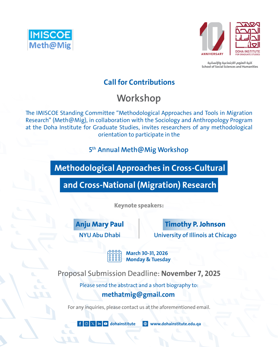 The in-person workshop is organized by the IMISCOE Standing Committee on Methodological Approaches and Tools in Migration Research (Meth@Mig) in collaboration with the Doha Institute for Graduate Studies, and will be held on March 30-31, 2026, in Doha, Qatar. There are no participation fees; however, attendees must cover their own travel costs to and from Qatar. Accommodation, transportation from/to the Doha Institute, and three meals/day will be covered for one presenting author per contribution for the duration of the stay (3 nights).